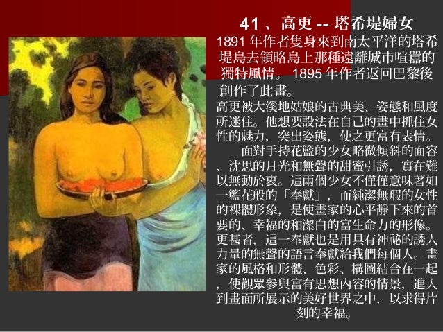 49. 49. 41 、高更 -- 塔希堤婦女 1891 年作者隻身來到南太平洋的塔希 堤島去領略島上那種遠離城市喧囂的 獨特風情。 1895 年作者返回巴黎後 創作了此畫。 高更被大溪地姑娘的古典美、姿態和風度 所迷住。他想要設法在自己的畫中抓住女 性的魅力,突出姿態,使之更富有表情。   面對手持花籃的少女略微傾斜的面容 、沈思的月光和無聲的甜蜜引誘,實在難 以無動於衷。這兩個少女不僅僅意味著如 一籃花般的「奉獻」,而純潔無瑕的女性 的裸體形象,是使畫家的心平靜下來的首 要的、幸福的和潔白的富生命力的形像。 更甚者,這一奉獻也是用具有神祕的誘人 力量的無聲的語言奉獻給我們每個人。畫 家的風格和形體、色彩、構圖結合在一起 ,使觀 參與富有思想內容的情景,進入眾 到畫面所展示的美好世界之中,以求得片 刻的幸福。