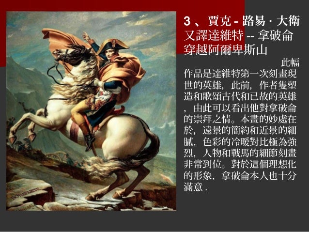 5. 5. 3 、賈克 - 路易 · 大衛 又譯達維特 -- 拿破侖 穿越阿爾卑斯山 此幅 作品是達維特第一次刻畫現 世的英雄,此前,作者隻塑 造和歌頌古代和已故的英雄 ,由此可以看出他對拿破侖 的崇拜之情。本畫的妙處在 於,遠景的簡約和近景的細 膩,色彩的冷暖對比極為強 烈,人物和戰馬的細節刻畫 非常到位。對於這個理想化 的形象,拿破侖本人也十分 滿意 .