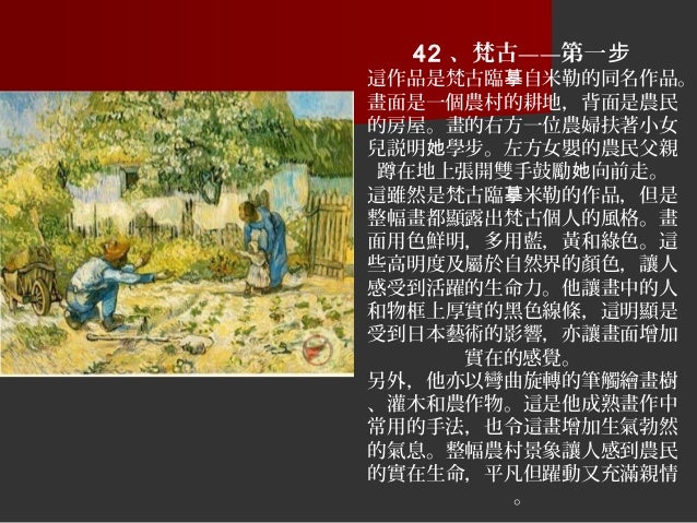 50. 50. 42 、梵古——第一步 這作品是梵古臨 自米勒的同名作品。摹 畫面是一個農村的耕地,背面是農民 的房屋。畫的右方一位農婦扶著小女 兒説明 學步。左方女嬰的農民父親她 蹲在地上張開雙手鼓勵 向前走。她 這雖然是梵古臨 米勒的作品,但是摹 整幅畫都顯露出梵古個人的風格。畫 面用色鮮明,多用藍,黃和綠色。這 些高明度及屬於自然界的顏色,讓人 感受到活躍的生命力。他讓畫中的人 和物框上厚實的黑色線條,這明顯是 受到日本藝術的影響,亦讓畫面增加 實在的感覺。 另外,他亦以彎曲旋轉的筆觸繪畫樹 、灌木和農作物。這是他成熟畫作中 常用的手法,也令這畫增加生氣勃然 的氣息。整幅農村景象讓人感到農民 的實在生命,平凡但躍動又充滿親情 。