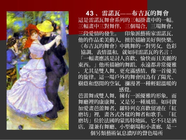 51. 51. 43 、雷諾瓦——布吉瓦的舞會 這是雷諾瓦舞會系列的三幅掛畫中的一幅。 三幅畫中三對舞伴,三個場合,三場舞會, 三段愛情的發生。 印象派藝術家雷諾瓦, 他的作品柔美動人,擅於描繪美好與快樂。 《布吉瓦的舞會》中跳舞的一對男女,色彩 協調,表情溫和,就如同雷諾瓦的名言: 「一幅畫應該是討人喜歡、愉快而且美麗的 東西。」他所描繪的舞蹈,永遠都非常優雅 ,尤其是雙人舞,更充滿感情,像一首優美 的旋律。這一場戶外的舞會因為有了陽光、 樹蔭和悠閒的空氣,瀰漫著一種輕鬆溫暖的 感覺。 芭蕾舞或雙人舞,擁有一派優雅的形象,而 舞廳裡的康康舞,又是另一種風情。如同竇 加愛畫芭蕾舞者,羅特列克喜歡留連在「紅 磨坊」裡,畫各式各樣的舞者和歌手。「紅 磨坊」位於法國的蒙馬特地區,它不只是酒 店,還兼有舞廳、小型劇場和小畫廊,是一 個另類藝術氣息濃厚的聲色場所