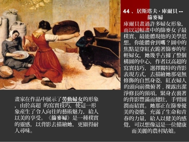 52. 52. 畫家在作品中展示了勞動婦女的形象 ,由於高超 的寫實技巧,使這一形 象産生了令人向往的藝術魅力,給人 以美的享受。《篩麥婦》是一種樸實 的靈感,以背影去描繪 ,更顯得耐她 人尋味。 44 、居斯塔夫 · 庫爾貝 -- 篩麥婦 庫爾貝畫過許多婦女形象, 而以這幅畫中的篩麥女子最 樸實、最能體現他的美學思 想。你能體會到 ?圖中的嗎 焦點是穿紅衣跪著篩麥的年 輕婦女, 幾乎占據了整個她 構圖的中心,作者以高超的 寫實技巧,選擇獨特的背影 表現方式,去描繪 那毫無她 修飾的自然身姿,紅衣婦人 的頭向前微俯著,裸露出潔 淨修長的頸項,緊身衣裹著 的背影豐滿而健壯,手臂圓 潤而結實。 那正在篩麥優她 美的姿態,充滿了生命和青 春的力量,給人以健美的感 覺,可以想像這是一位健康 而美麗的農村姑娘。
