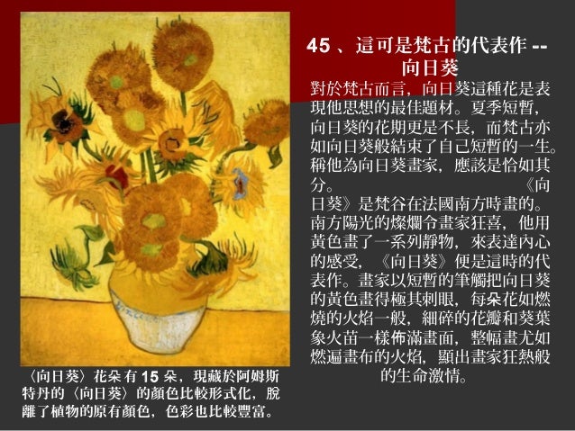 53. 53. 45 、這可是梵古的代表作 -- 向日葵 對於梵古而言,向日葵這種花是表 現他思想的最佳題材。夏季短暫, 向日葵的花期更是不長,而梵古亦 如向日葵般結束了自己短暫的一生。 稱他為向日葵畫家,應該是恰如其 分。 《向 日葵》是梵谷在法國南方時畫的。 南方陽光的燦爛令畫家狂喜,他用 黃色畫了一系列靜物,來表達內心 的感受,《向日葵》便是這時的代 表作。畫家以短暫的筆觸把向日葵 的黃色畫得極其刺眼,每 花如燃朵 燒的火焰一般,細碎的花瓣和葵葉 象火苗一樣 滿畫面,整幅畫尤如佈 燃遍畫布的火焰,顯出畫家狂熱般 的生命激情。〈向日葵〉花 有朵 15 ,現藏於阿姆斯朵 特丹的〈向日葵〉的顏色比較形式化,脫 離了植物的原有顏色,色彩也比較豐富。