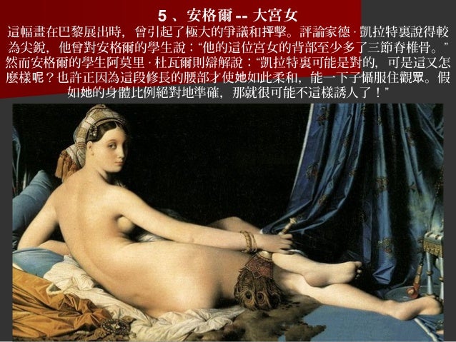 7. 7. 5 、安格爾 -- 大宮女 這幅畫在巴黎展出時,曾引起了極大的爭議和 擊。評論家德抨 · 凱拉特裏說得較 為尖銳,他曾對安格爾的學生說:“他的這位宮女的背部至少多了三節脊椎骨。” 然而安格爾的學生阿莫里 · 杜瓦爾則辯解說:“凱拉特裏可能是對的,可是這又怎 麼樣 ?也許正因為這段修長的腰部才使 如此柔和,能一下子懾服住觀 。假呢 她 眾 如 的身體比例絕對地準確,那就很可能不這樣誘人了!”她