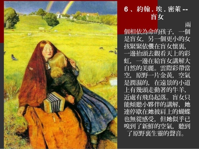 8. 8. 6 、約翰 . 埃 . 密萊 -- 盲女 兩 個相依為命的孩子,一個 是盲女,另一個更小的女 孩緊緊依 在盲女懷裏,偎 一邊抬頭去觀看天上的彩 虹,一邊在給盲女講解大 自然的美麗。雲際彩帶當 空,原野一片金黃,空氣 是潤濕的,在遠景的小道 上有幾頭走動著的牛羊, 近處有飛鳥起落。盲女只 能傾聽小夥伴的講解,她 連停歇在 披肩上的蝴蝶她 也無從感受,但 似乎已她 嗅到了新鮮的空氣,聽到 了原野裏生靈的聲音。
