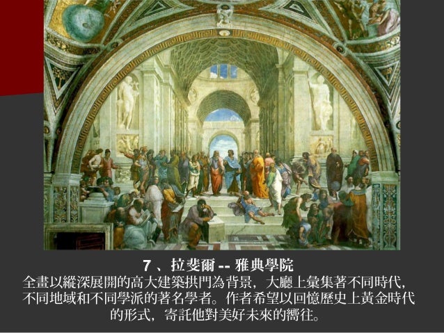 9. 9. 7 、拉斐爾 -- 雅典學院 全畫以縱深展開的高大建築拱門為背景,大廳上彙集著不同時代, 不同地域和不同學派的著名學者。作者希望以回憶歷史上黃金時代 的形式,寄託他對美好未來的嚮往。