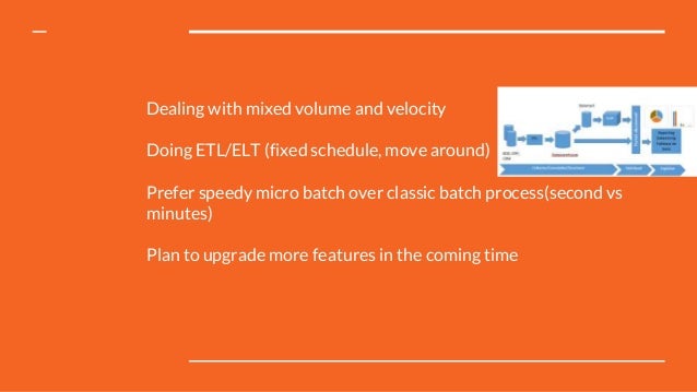 12. 12. Dealing with mixed volume and velocity Doing ETL/ELT (fixed schedule, move around) Prefer speedy micro batch over classic batch process(second vs minutes) Plan to upgrade more features in the coming time