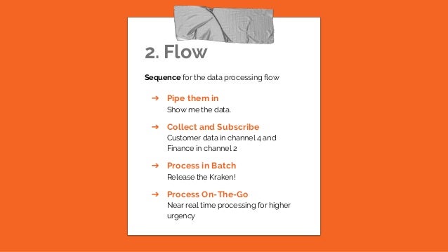 14. 14. 2. Flow Sequence for the data processing flow ➔ Pipe them in Show me the data. ➔ Collect and Subscribe Customer data in channel 4 and Finance in channel 2 ➔ Process in Batch Release the Kraken! ➔ Process On-The-Go Near real time processing for higher urgency