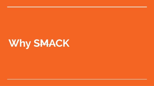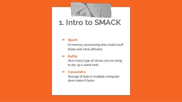 5. 5. 1. Intro to SMACK ➔ Spark In-memory processing does make stuff faster and more efficient. ➔ Kafka How many type of straws are we using to dry up a water tank. ➔ Cassandra Storage of data in multiple computer does make it faster.