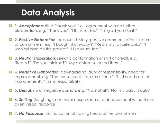 10. 10. Data Analysis 1. Acceptance: ritual "thank you", i.e., agreement with no furtherelaboration, e.g. "Thank you"; "I think so, too"; "Im glad you like it.” 2. Positive Elaboration: account, history, positive comment, efforts, returnof compliment, e.g. "I bought it at Macys"; "Red is my favorite color"; "Iworked hard on the project"; "I like yours, too.” 3. Neutral Elaboration: seeking conformation or shift of credit, e.g."Really?"; "Do you think so?"; "My assistant selected them.” 4. Negative Elaboration: downgrading, duty or responsibility, need forimprovement, e.g. "The house is a bit too small for us"; "I still need a lot ofimprovement"; "Its my responsibility.” 5. Denial: no or negative opinion, e.g. "No, not all"; "No, my baby is ugly.” 6. Smiling (laughing): non-verbal expression of embarrassment without anyovert verbal response 7. No Response: no indication of having heard of the compliment