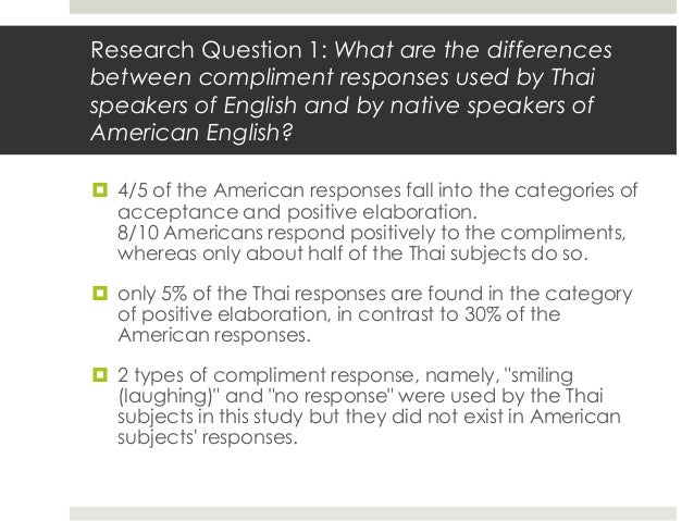 7. 7. The major research questions 1. What are the differences betweencompliment responses of Thai-speaking learnersof English and those of native speakers ofAmerican English ?