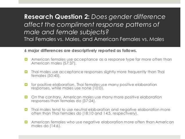  2. Does gender difference affect thecompliment response patterns of Thais andAmericans?
