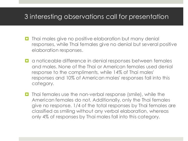 12. 12. 3 interesting observations call for presentation The first, as mentioned before, is that smiles have differentfunctions in each culture. The second observation is that the Thai and Americansubjects interpreted the purpose of complimentsdifferently The last interesting observation in this study is that someAmerican subjects tended to "return" the complimentsright after being complimented, whereas none of theThai subjects did