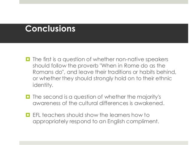 15. 15. Conclusions The first is a question of whether non-native speakersshould follow the proverb "When in Rome do as theRomans do", and leave their traditions or habits behind,or whether they should strongly hold on to their ethnicidentity. The second is a question of whether the majoritysawareness of the cultural differences is awakened. EFL teachers should show the learners how toappropriately respond to an English compliment.