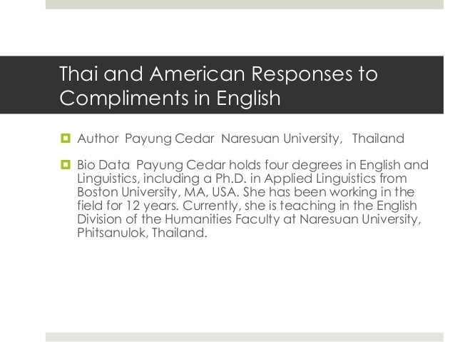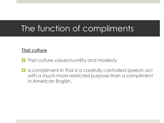 6. 6. The function of complimentsThai culture Thai culture values humility and modesty a compliment in Thai is a carefully controlled speech actwith a much more restricted purpose than a complimentin American English.
