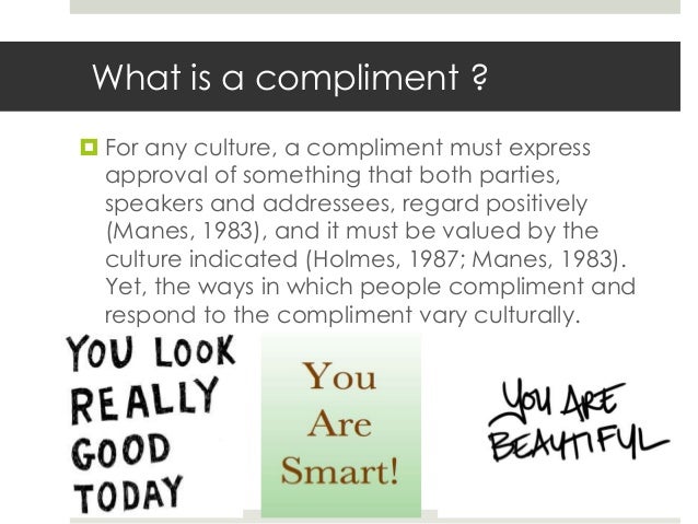 4. 4. What is a compliment ? For any culture, a compliment must expressapproval of something that both parties,speakers and addressees, regard positively(Manes, 1983), and it must be valued by theculture indicated (Holmes, 1987; Manes, 1983).Yet, the ways in which people compliment andrespond to the compliment vary culturally.