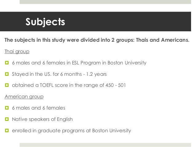 8. 8. SubjectsThe subjects in this study were divided into 2 groups: Thais and Americans.Thai group 6 males and 6 females in ESL Program in Boston University Stayed in the US. for 6 months - 1.2 years obtained a TOEFL score in the range of 450 - 501American group 6 males and 6 females Native speakers of English enrolled in graduate programs at Boston University