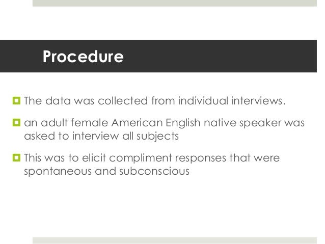 9. 9. Procedure The data was collected from individual interviews. an adult female American English native speaker wasasked to interview all subjects This was to elicit compliment responses that werespontaneous and subconscious