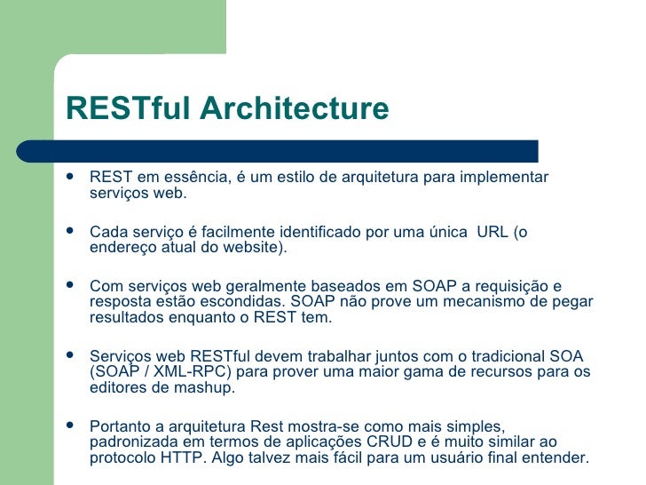 4. 4. RESTful Architecture <ul><li>REST em essência, é um estilo de arquitetura para implementar serviços web. </li></ul><ul><li>Cada serviço é facilmente identificado por uma única   URL (o endereço atual do website). </li></ul><ul><li>Com serviços web geralmente baseados em SOAP a requisição e resposta estão escondidas. SOAP não prove um mecanismo de pegar resultados enquanto o REST tem. </li></ul><ul><li>Serviços web RESTful devem trabalhar juntos com o tradicional SOA (SOAP / XML-RPC) para prover uma maior gama de recursos para os editores de mashup. </li></ul><ul><li>Portanto a arquitetura Rest mostra-se como mais simples, padronizada em termos de aplicações CRUD e é muito similar ao protocolo HTTP. Algo talvez mais fácil para um usuário final entender. </li></ul>