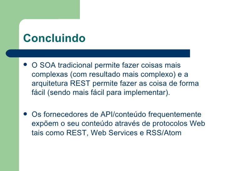 5. 5. Concluindo <ul><li>O SOA tradicional permite fazer coisas mais complexas (com resultado mais complexo) e a arquitetura REST permite fazer as coisa de forma fácil (sendo mais fácil para implementar). </li></ul><ul><li>Os fornecedores de API/conteúdo frequentemente expõem o seu conteúdo através de protocolos Web tais como REST, Web Services e RSS/Atom </li></ul>