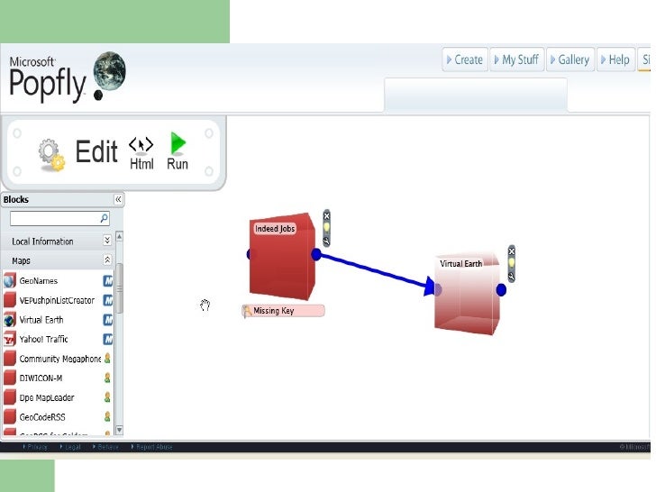 6. 6. Editores de Mashup <ul><li>http://www.popfly.com </li></ul><ul><ul><li>Editor de mashups da Microsoft que utiliza blocos de serviços SOA. </li></ul></ul><ul><ul><li>Exemplo: http://www.youtube.com/watch?v=l7LMq25zdYE </li></ul></ul>