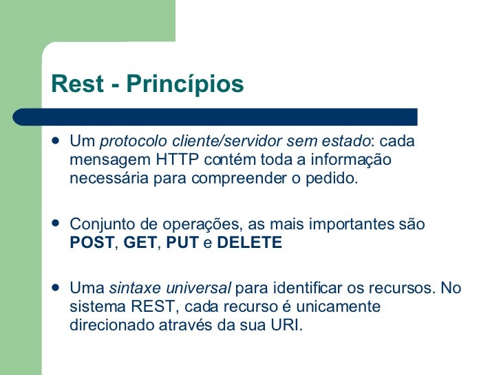 11. 11. Rest - Princípios <ul><li>Um protocolo cliente/servidor sem estado : cada mensagem HTTP contém toda a informação necessária para compreender o pedido. </li></ul><ul><li>Conjunto de operações, as mais importantes são POST , GET , PUT e DELETE </li></ul><ul><li>Uma sintaxe universal para identificar os recursos. No sistema REST, cada recurso é unicamente direcionado através da sua URI . </li></ul>