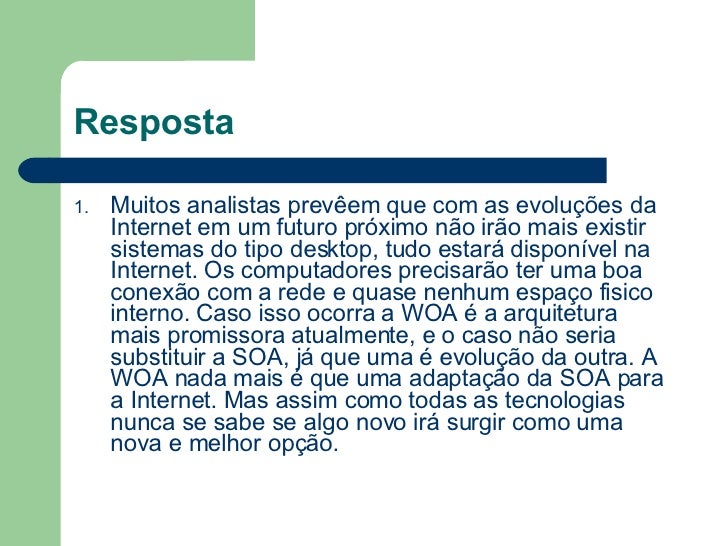 14. 14. Resposta <ul><li>Muitos analistas prevêem que com as evoluções da Internet em um futuro próximo não irão mais existir sistemas do tipo desktop, tudo estará disponível na Internet. Os computadores precisarão ter uma boa conexão com a rede e quase nenhum espaço fisico interno. Caso isso ocorra a WOA é a arquitetura mais promissora atualmente, e o caso não seria substituir a SOA, já que uma é evolução da outra. A WOA nada mais é que uma adaptação da SOA para a Internet. Mas assim como todas as tecnologias nunca se sabe se algo novo irá surgir como uma nova e melhor opção. </li></ul>
