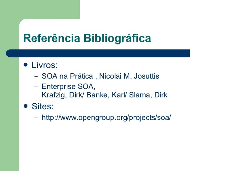 15. 15. Referência Bibliográfica <ul><li>Livros: </li></ul><ul><ul><li>SOA na Prática , Nicolai M. Josuttis </li></ul></ul><ul><ul><li>Enterprise SOA, Krafzig, Dirk/ Banke, Karl/ Slama, Dirk </li></ul></ul><ul><li>Sites: </li></ul><ul><ul><li>http://www.opengroup.org/projects/soa/ </li></ul></ul>