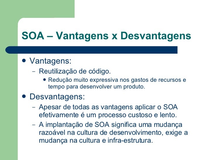 7. 7. SOA – Vantagens x Desvantagens <ul><li>Vantagens: </li></ul><ul><ul><li>Reutilização de código.      </li></ul></ul><ul><ul><ul><li>Redução muito expressiva nos gastos de recursos e tempo para desenvolver um produto. </li></ul></ul></ul><ul><li>Desvantagens: </li></ul><ul><ul><li>Apesar de todas as vantagens aplicar o SOA efetivamente é um processo custoso e lento.         </li></ul></ul><ul><ul><li>A implantação de SOA significa uma mudança razoável na cultura de desenvolvimento, exige a mudança na cultura e infra-estrutura. </li></ul></ul>