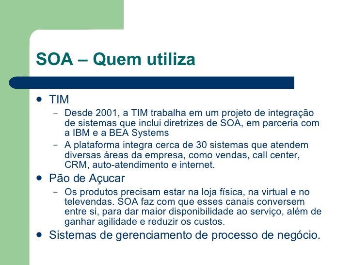 8. 8. SOA – Quem utiliza <ul><li>TIM </li></ul><ul><ul><li>Desde 2001, a TIM trabalha em um projeto de integração de sistemas que inclui diretrizes de SOA, em parceria com a IBM e a BEA Systems </li></ul></ul><ul><ul><li>A plataforma integra cerca de 30 sistemas que atendem diversas áreas da empresa, como vendas, call center, CRM, auto-atendimento e internet. </li></ul></ul><ul><li>Pão de Açucar </li></ul><ul><ul><li>Os produtos precisam estar na loja física, na virtual e no televendas. SOA faz com que esses canais conversem entre si, para dar maior disponibilidade ao serviço, além de ganhar agilidade e reduzir os custos. </li></ul></ul><ul><li>Sistemas de gerenciamento de processo de negócio. </li></ul>