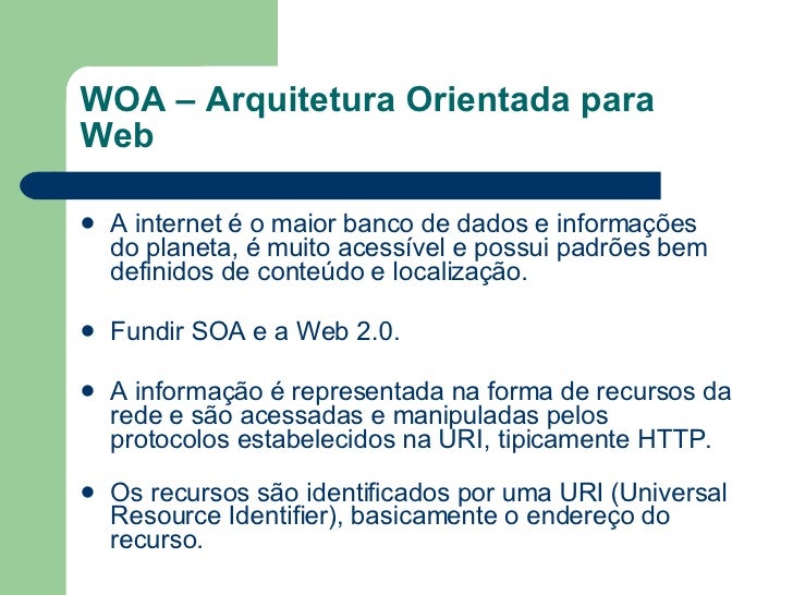 9. 9. WOA – Arquitetura Orientada para Web <ul><li>A internet é o maior banco de dados e informações do planeta, é muito acessível e possui padrões bem definidos de conteúdo e localização. </li></ul><ul><li>         </li></ul><ul><li>Fundir SOA e a Web 2.0. </li></ul><ul><li>A informação é representada na forma de recursos da rede e são acessadas e manipuladas pelos protocolos estabelecidos na URI, tipicamente HTTP.          </li></ul><ul><li>Os recursos são identificados por uma URI (Universal Resource Identifier), basicamente o endereço do recurso. </li></ul>