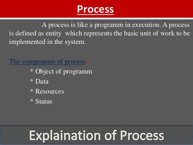 2. 2. Process A process is like a programm in execution. A process is defined as entity which represents the basic unit of work to be implemented in the system. The components of process:- * Object of programm * Data * Resources * Status