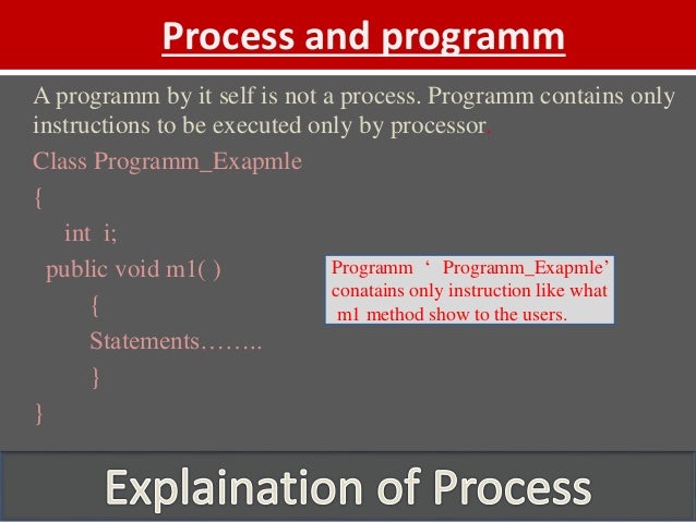 3. 3. Process and programm A programm by it self is not a process. Programm contains only instructions to be executed only by processor. Class Programm_Exapmle { int i; public void m1( ) { Statements…….. } } Programm ‘ Programm_Exapmle’ conatains only instruction like what m1 method show to the users.