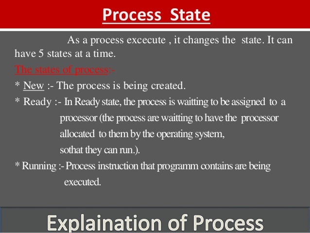 4. 4. Process State As a process excecute , it changes the state. It can have 5 states at a time. The states of process:- * New :- The process is being created. * Ready :- InReadystate, theprocessiswaitting tobeassigned to a processor(theprocessarewaitting tohavethe processor allocated tothembytheoperatingsystem, sothattheycanrun.). *Running:-Processinstruction thatprogrammcontainsarebeing executed.