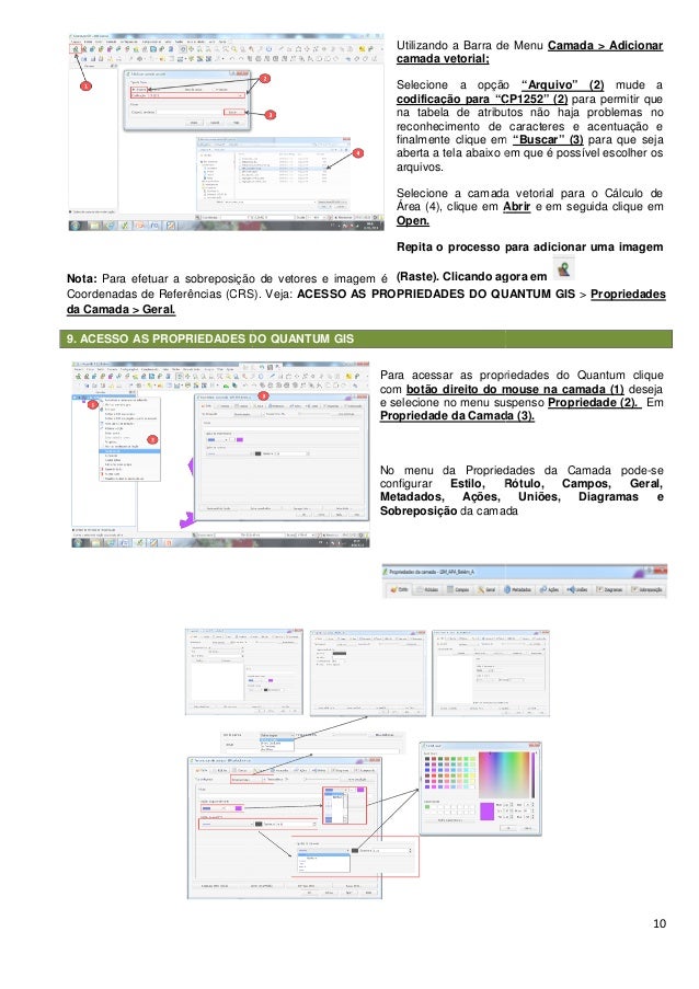 10. 10. Nota: Para efetuar a sobreposição de vetores e imagem Coordenadas de Referências (CRS da Camada > Geral. 9. ACESSO AS PROPRIEDADES DO QUANTUM GIS a sobreposição de vetores e imagem é necessário que ambos estejam com o Sistema de CRS). Veja: ACESSO AS PROPRIEDADES DO QUANTUM GIS PROPRIEDADES DO QUANTUM GIS Utilizando a Barra de Menu camada vetorial; Selecione a opção codificação para “CP1252” na tabela de atributos não haja problemas no reconhecimento de caracteres e acentuação e finalmente clique em aberta a tela abaixo em que é possível arquivos. Selecione a camada vetorial para o Cálculo de Área (4), clique em Abrir Open. Repita o processo para adicionar uma imagem (Raste). Clicando agora em Para acessar as propriedades do Quantum clique com botão direito do mouse na camada e selecione no menu suspenso Propriedade da Camada No menu da Propriedades da Camada pode configurar Estilo, Rótulo, Campos, Geral, Metadados, Ações, Uniões, Diagramas e Sobreposição da camada 10 ambos estejam com o Sistema de ACESSO AS PROPRIEDADES DO QUANTUM GIS > Propriedades a Barra de Menu Camada > Adicionar Selecione a opção “Arquivo” (2) mude a codificação para “CP1252” (2) para permitir que tabela de atributos não haja problemas no reconhecimento de caracteres e acentuação e finalmente clique em “Buscar” (3) para que seja aberta a tela abaixo em que é possível escolher os Selecione a camada vetorial para o Cálculo de Abrir e em seguida clique em Repita o processo para adicionar uma imagem ). Clicando agora em ra acessar as propriedades do Quantum clique botão direito do mouse na camada (1) deseja e selecione no menu suspenso Propriedade (2). Em Propriedade da Camada (3). da Propriedades da Camada pode-se Estilo, Rótulo, Campos, Geral, Metadados, Ações, Uniões, Diagramas e da camada