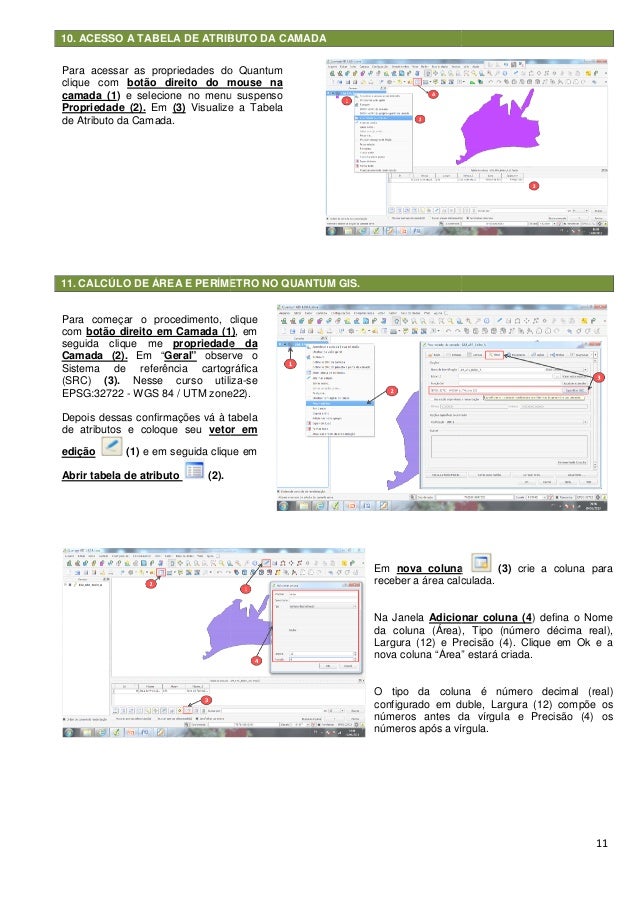 11. 11. 10. ACESSO A TABELA DE ATRIBUTO DA CAMADA 11. CALCÚLO DE ÁREA E PERÍMETRO NO QUANTUM GIS. Para começar o procedimento, clique com botão direito em Camada (1) seguida clique me propriedade da Camada (2). Em “Geral” observe o Sistema de referência cartográfica (SRC) (3). Nesse curso utiliza EPSG:32722 - WGS 84 / UTM zone22). Depois dessas confirmações vá à tabela de atributos e coloque seu vetor em edição (1) e em seguida clique em Abrir tabela de atributo (2). Para acessar as propriedades do Quantum clique com botão direito do mouse na camada (1) e selecione no menu suspenso Propriedade (2). Em (3) Visualize a Tabela de Atributo da Camada. 10. ACESSO A TABELA DE ATRIBUTO DA CAMADA 11. CALCÚLO DE ÁREA E PERÍMETRO NO QUANTUM GIS. Para começar o procedimento, clique botão direito em Camada (1), em propriedade da observe o Sistema de referência cartográfica Nesse curso utiliza-se WGS 84 / UTM zone22). Depois dessas confirmações vá à tabela vetor em e em seguida clique em ra acessar as propriedades do Quantum direito do mouse na e selecione no menu suspenso Visualize a Tabela Em nova coluna receber a área calculada. Na Janela Adicionar coluna (4 da coluna (Área), Tipo (número décima real), Largura (12) e Precisão (4). Clique em Ok e a nova coluna “Área” estará criada. O tipo da coluna é número decimal (real) configurado em duble, números antes da vírgula e Precisão (4) os números após a vírgula. 11 nova coluna (3) crie a coluna para receber a área calculada. Adicionar coluna (4) defina o Nome da coluna (Área), Tipo (número décima real), Largura (12) e Precisão (4). Clique em Ok e a nova coluna “Área” estará criada. O tipo da coluna é número decimal (real) configurado em duble, Largura (12) compõe os números antes da vírgula e Precisão (4) os números após a vírgula.