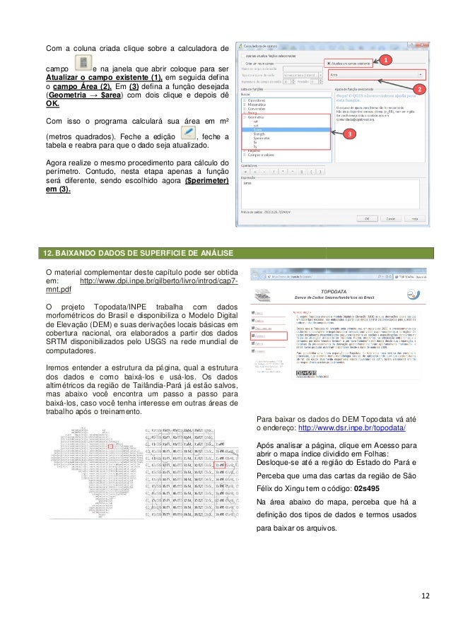 12. 12. 12. BAIXANDO DADOS DE SUPERFICIE DE ANÁLISE Com a coluna criada clique sobre a calculadora de campo e na janela que abrir Atualizar o campo existente (1), o campo Área (2). Em (3) defina a função desejada (Geometria → $area) com dois clique OK. Com isso o programa calculará sua área em m (metros quadrados). Feche a edição tabela e reabra para que o dado seja atualizado. Agora realize o mesmo procedimento para cálculo do perímetro. Contudo, nesta etapa apenas a função será diferente, sendo escolhido agora em (3). O material complementar deste capítulo pode ser obtida em: http://www.dpi.inpe.br/gilberto/livro/introd/cap7 mnt.pdf O projeto Topodata/INPE trabalha com dados morfométricos do Brasil e disponibiliza o Modelo Digital de Elevação (DEM) e suas derivações locais básicas em cobertura nacional, ora elaborados a partir dos dados SRTM disponibilizados pelo USGS na rede mundial de computadores. Iremos entender a estrutura da página, qual a estrutura dos dados e como baixá-los e usá altimétricos da região de Tailândia mas abaixo você encontra um passo a passo para baixá-los, caso você tenha interesse em outras áreas de trabalho após o treinamento. SUPERFICIE DE ANÁLISE Com a coluna criada clique sobre a calculadora de e na janela que abrir coloque para ser em seguida defina defina a função desejada ) com dois clique e depois dê Com isso o programa calculará sua área em m² . Feche a edição , feche a reabra para que o dado seja atualizado. Agora realize o mesmo procedimento para cálculo do pa apenas a função será diferente, sendo escolhido agora ($perimeter) este capítulo pode ser obtida http://www.dpi.inpe.br/gilberto/livro/introd/cap7- O projeto Topodata/INPE trabalha com dados morfométricos do Brasil e disponibiliza o Modelo Digital M) e suas derivações locais básicas em cobertura nacional, ora elaborados a partir dos dados SRTM disponibilizados pelo USGS na rede mundial de Iremos entender a estrutura da página, qual a estrutura los e usá-los. Os dados Tailândia-Pará já estão salvos, mas abaixo você encontra um passo a passo para los, caso você tenha interesse em outras áreas de Para baixar os dados do DEM Topodata o endereço: http://www.dsr.inpe.br/topodata/ Após analisar a página, clique em Acesso para abrir o mapa índice dividido em Folhas: Desloque-se até a região do Estado do Pará e Perceba que uma das cart Félix do Xingu tem o código: Na área abaixo do mapa, perceba que há a definição dos tipos de dados e termos usados para baixar os arquivos. 12 Para baixar os dados do DEM Topodata vá até http://www.dsr.inpe.br/topodata/ Após analisar a página, clique em Acesso para abrir o mapa índice dividido em Folhas: se até a região do Estado do Pará e Perceba que uma das cartas da região de São Félix do Xingu tem o código: 02s495 Na área abaixo do mapa, perceba que há a definição dos tipos de dados e termos usados para baixar os arquivos.