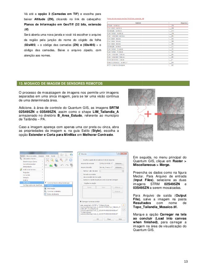 13. 13. 13. MOSAICO DE IMAGEM DE SENSORES REMOTOS Vá até a opção 3 (Camadas em TIF) baixar Altitude (ZN), clicando no link do cabeçalho: Planos de Informação em GeoTiff (32 bits, extensão .tif) Será aberta uma nova janela e você irá escolher o arquivo da região pela junção do nome do cógido da folha (02s495) + o código das camadas código das camadas. Baixe o arquivo zipado, com atenção aos nomes. O processo de mosaicagem de imagens nos permite unir imagens separadas em uma única imagem, para se ter de uma determinada área. Adicione, à área de controle do Quantum GIS, as imagens 02S495ZN e 03S495ZN, assim como o shape armazenado no diretório B_Area_Estudo de Tailândia – PA. Caso a imagem apareça com apenas uma cor preta ou cinza, abra as propriedades da imagem e, na guia Estilo ( opção Estender e Corta para MinMax 13. MOSAICO DE IMAGEM DE SENSORES REMOTOS opção 3 (Camadas em TIF) e escolha para clicando no link do cabeçalho: Planos de Informação em GeoTiff (32 bits, extensão Será aberta uma nova janela e você irá escolher o arquivo pela junção do nome do cógido da folha ) + o código das camadas (ZN) e (03s495) + o Baixe o arquivo zipado, com O processo de mosaicagem de imagens nos permite unir imagens separadas em uma única imagem, para se ter uma visão contínua Adicione, à área de controle do Quantum GIS, as imagens SRTM , assim como o shape LIM_Tailandia_A B_Area_Estudo, referente ao município em apareça com apenas uma cor preta ou cinza, abra as propriedades da imagem e, na guia Estilo (Style), escolha a Estender e Corta para MinMax em Melhorar Contraste. Em seguida, no menu Quantum GIS, clique em Miscellaneous > Merge. Preencha os dados como na figura Meclar (Input Files imagens 03S495ZN Para File), salve a imagem na pasta Resultados Topo_Tailandia_ Marque a opção ao concluir when finished imagem na área de visualização do Quantum GIS. 13 Em seguida, no menu principal do Quantum GIS, clique em Raster > Miscellaneous > Merge. Preencha os dados como na figura Meclar. Para Arquivo de entrada Input Files), selecione as duas imagens STRM 02S495ZN e 03S495ZN a serem mosaicadas. Para Arquivo de saída (Output , salve a imagem na pasta Resultados com nome de Topo_Tailandia_Mosaico.tif. Marque a opção Carregar na tela ao concluir (Load into canvas when finished), para carregar a imagem na área de visualização do Quantum GIS.