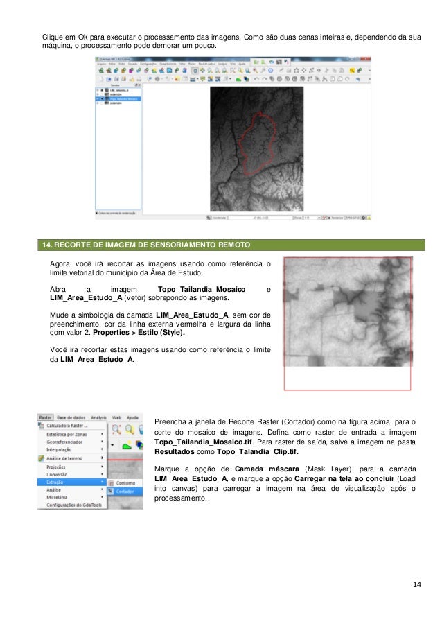 14. 14. 14 Clique em Ok para executar o processamento das imagens. Como são duas cenas inteiras e, dependendo da sua máquina, o processamento pode demorar um pouco. 14. RECORTE DE IMAGEM DE SENSORIAMENTO REMOTO Preencha a janela de Recorte Raster (Cortador) como na figura acima, para o corte do mosaico de imagens. Defina como raster de entrada a imagem Topo_Tailandia_Mosaico.tif. Para raster de saída, salve a imagem na pasta Resultados como Topo_Talandia_Clip.tif. Marque a opção de Camada máscara (Mask Layer), para a camada LIM_Area_Estudo_A, e marque a opção Carregar na tela ao concluir (Load into canvas) para carregar a imagem na área de visualização após o processamento. Agora, você irá recortar as imagens usando como referência o limite vetorial do município da Área de Estudo. Abra a imagem Topo_Tailandia_Mosaico e LIM_Area_Estudo_A (vetor) sobrepondo as imagens. Mude a simbologia da camada LIM_Area_Estudo_A, sem cor de preenchimento, cor da linha externa vermelha e largura da linha com valor 2. Properties > Estilo (Style). Você irá recortar estas imagens usando como referência o limite da LIM_Area_Estudo_A. Na área de menus do Quantum GIS, clique em Raster >