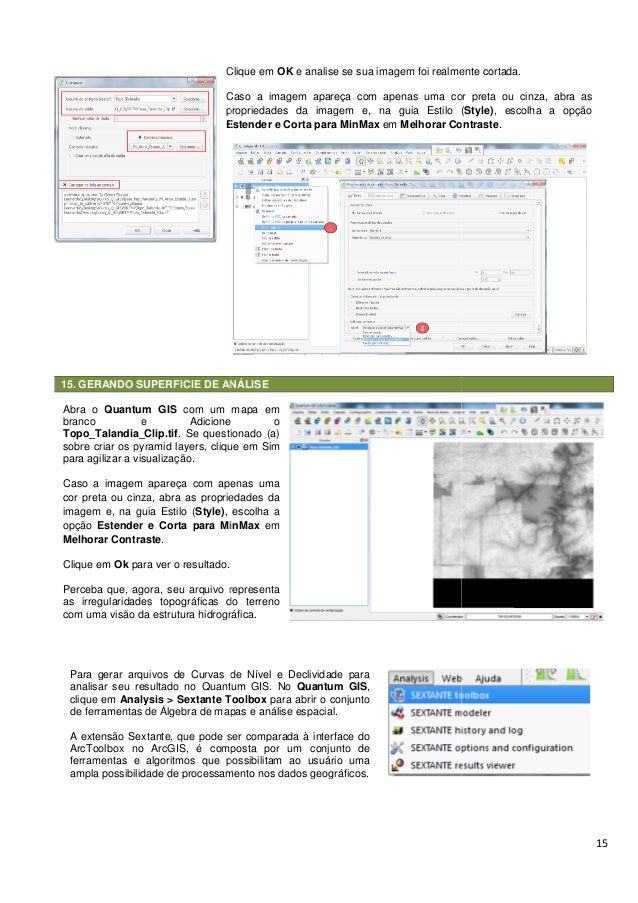 15. 15. 15. GERANDO SUPERFICIE DE ANÁLISE Clique em Caso a imagem apareça com apenas uma cor preta ou cinza, abra as propriedades da imagem e, na guia Estender e Corta para MinMax Abra o Quantum GIS com um mapa em branco e Adicione o Topo_Talandia_Clip.tif. Se questionado (a) sobre criar os pyramid layers, clique em Sim para agilizar a visualização. Caso a imagem apareça com apenas uma cor preta ou cinza, abra as propriedades da imagem e, na guia Estilo (Style), escolha a opção Estender e Corta para MinMax Melhorar Contraste. Clique em Ok para ver o resultado. Perceba que, agora, seu arquivo representa as irregularidades topográficas do terreno com uma visão da estrutura hidrográfica. Para gerar arquivos de Curvas de Nível e Declividade para analisar seu resultado no Quantum GIS. N clique em Analysis > Sextante Toolbox de ferramentas de Álgebra de mapas e análise espacial A extensão Sextante, que pode ser comparada à interface do ArcToolbox no ArcGIS, é composta por um conjunto de ferramentas e algoritmos que possibilitam ao usuário uma ampla possibilidade de processamento nos dados geográficos. GERANDO SUPERFICIE DE ANÁLISE Clique em OK e analise se sua imagem foi realmente cortada. Caso a imagem apareça com apenas uma cor preta ou cinza, abra as propriedades da imagem e, na guia Estilo ( Estender e Corta para MinMax em Melhorar Contraste com um mapa em e Adicione o . Se questionado (a) pyramid layers, clique em Sim Caso a imagem apareça com apenas uma cor preta ou cinza, abra as propriedades da , escolha a Estender e Corta para MinMax em Perceba que, agora, seu arquivo representa as irregularidades topográficas do terreno hidrográfica. Para gerar arquivos de Curvas de Nível e Declividade para r seu resultado no Quantum GIS. No Quantum GIS, Analysis > Sextante Toolbox para abrir o conjunto de ferramentas de Álgebra de mapas e análise espacial. A extensão Sextante, que pode ser comparada à interface do ArcToolbox no ArcGIS, é composta por um conjunto de ferramentas e algoritmos que possibilitam ao usuário uma sibilidade de processamento nos dados geográficos. 15 e analise se sua imagem foi realmente cortada. Caso a imagem apareça com apenas uma cor preta ou cinza, abra as Estilo (Style), escolha a opção Melhorar Contraste.