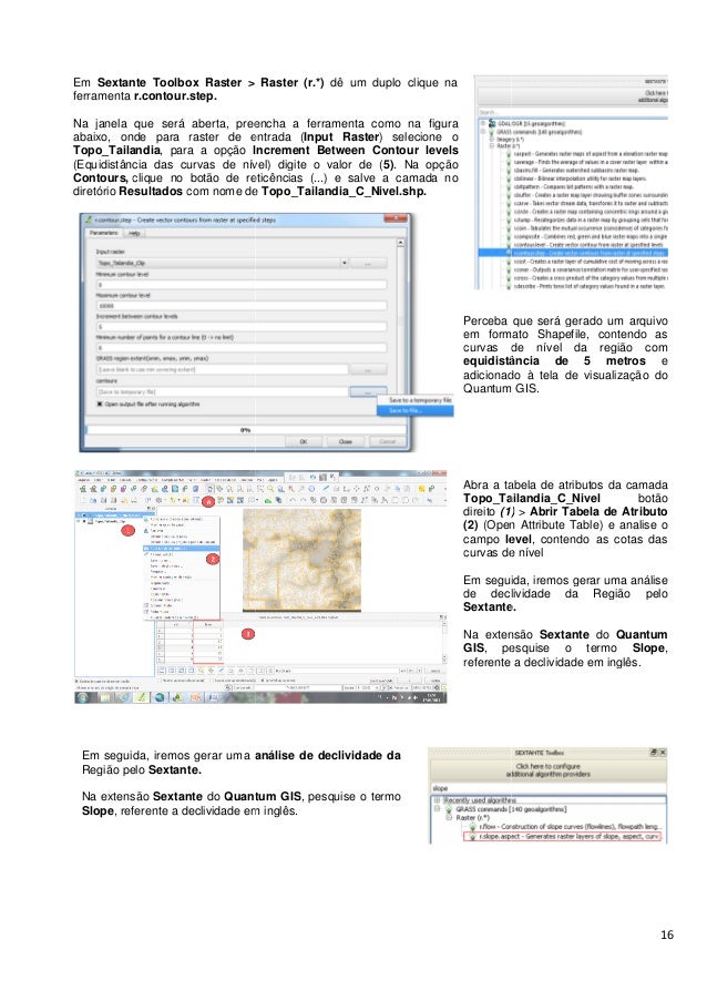 16. 16. Em Sextante Toolbox Raster > Raster (r.*) ferramenta r.contour.step. Na janela que será aberta, preencha a ferramenta como na figura abaixo, onde para raster de entrada ( Topo_Tailandia, para a opção Increment Between Contour levels (Equidistância das curvas de nível) digite o valor de Contours, clique no botão de reticências (...) e salve a camada no diretório Resultados com nome de Em seguida, iremos gerar uma análise de Região pelo Sextante. Na extensão Sextante do Quantum GIS Slope, referente a declividade em inglês. Raster > Raster (r.*) dê um duplo clique na Na janela que será aberta, preencha a ferramenta como na figura raster de entrada (Input Raster) selecione o Increment Between Contour levels (Equidistância das curvas de nível) digite o valor de (5). Na opção clique no botão de reticências (...) e salve a camada no com nome de Topo_Tailandia_C_Nivel.shp. Perceba que será gerado um arquivo em formato Shapefile, contendo as curvas de nível da região com equidistância de 5 metros adicionado à tela de visualização do Quantum GIS. Abra a tabela de atributos da camada Topo_Tailandia_ direito (1) (2) (Open Attribute Table) e analise o campo level curvas de nível Em seguida, iremos gerar uma análise de declividade da Região pelo Sextante. Na extensão GIS, pesquise o termo referente a declividade em inglês. análise de declividade da Quantum GIS, pesquise o termo , referente a declividade em inglês. 16 Perceba que será gerado um arquivo em formato Shapefile, contendo as curvas de nível da região com equidistância de 5 metros e adicionado à tela de visualização do Quantum GIS. Abra a tabela de atributos da camada Topo_Tailandia_C_Nivel botão (1) > Abrir Tabela de Atributo Open Attribute Table) e analise o level, contendo as cotas das curvas de nível Em seguida, iremos gerar uma análise de declividade da Região pelo Sextante. Na extensão Sextante do Quantum , pesquise o termo Slope, referente a declividade em inglês.
