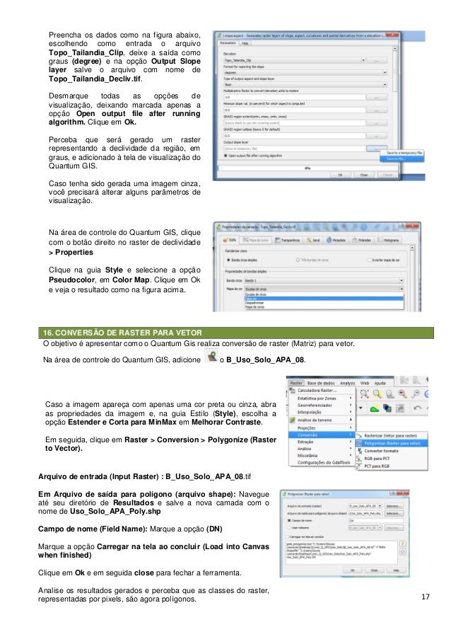 17. 17. 17 16. CONVERSÃO DE RASTER PARA VETOR O objetivo é apresentar como o Quantum Gis realiza conversão de raster (Matriz) para vetor. Na área de controle do Quantum GIS, adicione o B_Uso_Solo_APA_08. Preencha os dados como na figura abaixo, escolhendo como entrada o arquivo Topo_Tailandia_Clip, deixe a saída como graus (degree) e na opção Output Slope layer salve o arquivo com nome de Topo_Tailandia_Decliv.tif. Desmarque todas as opções de visualização, deixando marcada apenas a opção Open output file after running algorithm. Clique em Ok. Perceba que será gerado um raster representando a declividade da região, em graus, e adicionado à tela de visualização do Quantum GIS. Caso tenha sido gerada uma imagem cinza, você precisará alterar alguns parâmetros de visualização. Na área de controle do Quantum GIS, clique com o botão direito no raster de declividade > Properties Clique na guia Style e selecione a opção Pseudocolor, em Color Map. Clique em Ok e veja o resultado como na figura acima. Caso a imagem apareça com apenas uma cor preta ou cinza, abra as propriedades da imagem e, na guia Estilo (Style), escolha a opção Estender e Corta para MinMax em Melhorar Contraste. Em seguida, clique em Raster > Conversion > Polygonize (Raster to Vector). Arquivo de entrada (Input Raster) : B_Uso_Solo_APA_08.tif Em Arquivo de saída para polígono (arquivo shape): Navegue até seu diretório de Resultados e salve a nova camada com o nome de Uso_Solo_APA_Poly.shp Campo de nome (Field Name): Marque a opção (DN) Marque a opção Carregar na tela ao concluir (Load into Canvas when finished) Clique em Ok e em seguida close para fechar a ferramenta. Analise os resultados gerados e perceba que as classes do raster, representadas por pixels, são agora polígonos.