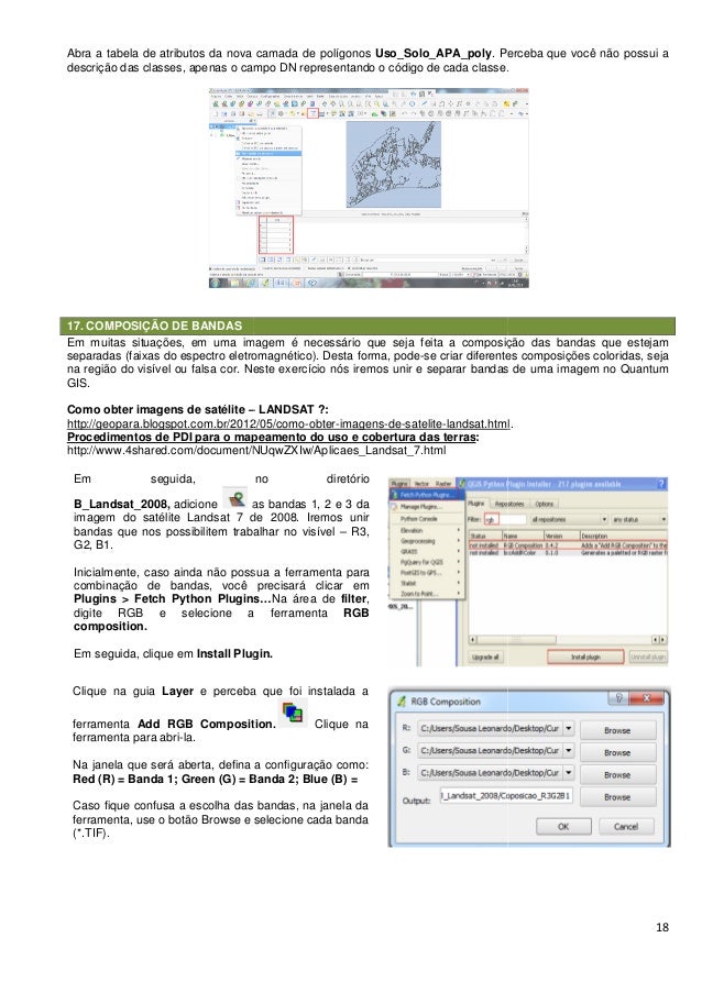 18. 18. Abra a tabela de atributos da nova camada de polígonos descrição das classes, apenas o campo DN representando o código de cada classe. 17. COMPOSIÇÃO DE BANDAS Em muitas situações, em uma imagem é necessário que seja feita a composição das bandas que estejam separadas (faixas do espectro eletromagnético). Desta forma, pode na região do visível ou falsa cor. Neste ex GIS. Como obter imagens de satélite – http://geopara.blogspot.com.br/2012/05/como Procedimentos de PDI para o mapeamento do uso e cobertura das terras http://www.4shared.com/document/NUqwZXIw/Aplicaes_Landsat_7.html Em seguida, no diretório B_Landsat_2008, adicione as bandas 1, 2 e 3 da imagem do satélite Landsat 7 de 2008. Iremos unir bandas que nos possibilitem trabalhar no visível G2, B1. Inicialmente, caso ainda não possua a ferramenta para combinação de bandas, você precisará clicar em Plugins > Fetch Python Plugins… digite RGB e selecione a ferramenta composition. Em seguida, clique em Install Plugin. Clique na guia Layer e perceba que foi instalada a ferramenta Add RGB Composition. ferramenta para abri-la. Na janela que será aberta, defina a configuração como: Red (R) = Banda 1; Green (G) = Banda 2; Blue (B) = Caso fique confusa a escolha das bandas, na janela da ferramenta, use o botão Browse e selecione cada banda (*.TIF). Abra a tabela de atributos da nova camada de polígonos Uso_Solo_APA_poly. Perceba que você não possui a descrição das classes, apenas o campo DN representando o código de cada classe. Em muitas situações, em uma imagem é necessário que seja feita a composição das bandas que estejam separadas (faixas do espectro eletromagnético). Desta forma, pode-se criar diferentes composições coloridas, seja na região do visível ou falsa cor. Neste exercício nós iremos unir e separar bandas de uma imagem no Quantum – LANDSAT ?: http://geopara.blogspot.com.br/2012/05/como-obter-imagens-de-satelite-landsat.html Procedimentos de PDI para o mapeamento do uso e cobertura das terras: http://www.4shared.com/document/NUqwZXIw/Aplicaes_Landsat_7.html Em seguida, no diretório as bandas 1, 2 e 3 da imagem do satélite Landsat 7 de 2008. Iremos unir bandas que nos possibilitem trabalhar no visível – R3, Inicialmente, caso ainda não possua a ferramenta para combinação de bandas, você precisará clicar em Python Plugins…Na área de filter, digite RGB e selecione a ferramenta RGB Install Plugin. e perceba que foi instalada a Add RGB Composition. Clique na Na janela que será aberta, defina a configuração como: en (G) = Banda 2; Blue (B) = Caso fique confusa a escolha das bandas, na janela da e selecione cada banda 18 . Perceba que você não possui a descrição das classes, apenas o campo DN representando o código de cada classe. Em muitas situações, em uma imagem é necessário que seja feita a composição das bandas que estejam se criar diferentes composições coloridas, seja ercício nós iremos unir e separar bandas de uma imagem no Quantum landsat.html.