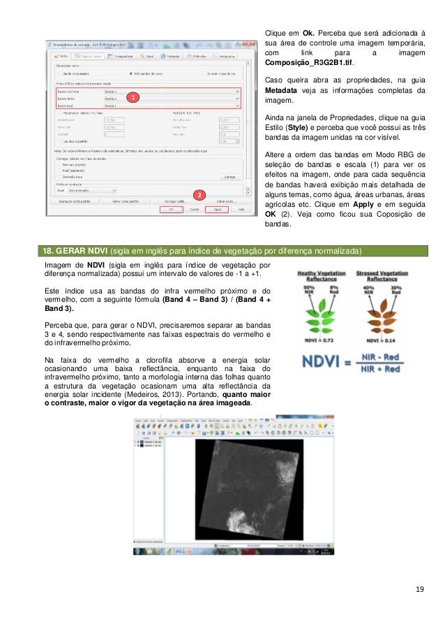 19. 19. 18. GERAR NDVI (sigla em inglês para índice de vegetação por Imagem de NDVI (sigla em inglês para índice de vegetação por diferença normalizada) possui um intervalo de valores de Este índice usa as bandas do infra vermelho próximo e do vermelho, com a seguinte fórmula Band 3). Perceba que, para gerar o NDVI, precisaremos separar as bandas 3 e 4, sendo respectivamente nas faixas espectrais do vermelho e do infravermelho próximo. Na faixa do vermelho a clorofila absorve a energia solar ocasionando uma baixa reflectância, enquanto na faixa do infravermelho próximo, tanto a morfologia interna das folhas quanto a estrutura da vegetação ocasionam uma alta reflectância da energia solar incidente (Medeiros, 2013 o contraste, maior o vigor da vegetação na área imageada (sigla em inglês para índice de vegetação por diferença normalizada) Clique em Ok. Perceba que será adicionada à sua área de controle uma imagem com link para a imagem Composição_R3G2B1 Caso queira abra as propriedades, na guia Metadata veja as i imagem. Ainda na janela de Propriedade Estilo (Style) e perceba que você possui as três bandas da imagem unidas na cor visível. Altere a ordem das bandas seleção de bandas e escala (1) efeitos na imagem, onde para cada sequência de bandas haverá exib alguns temas, como água, áreas urbanas, áreas agrícolas etc. Clique em OK (2). Veja como ficou sua Coposição de bandas. (sigla em inglês para índice de vegetação por diferença normalizada) possui um intervalo de valores de -1 a +1. Este índice usa as bandas do infra vermelho próximo e do vermelho, com a seguinte fórmula (Band 4 – Band 3) / (Band 4 + Perceba que, para gerar o NDVI, precisaremos separar as bandas 3 e 4, sendo respectivamente nas faixas espectrais do vermelho e Na faixa do vermelho a clorofila absorve a energia solar ocasionando uma baixa reflectância, enquanto na faixa do infravermelho próximo, tanto a morfologia interna das folhas quanto a estrutura da vegetação ocasionam uma alta reflectância da , 2013). Portando, quanto maior raste, maior o vigor da vegetação na área imageada. 19 diferença normalizada) Perceba que será adicionada à sua área de controle uma imagem temporária, com link para a imagem R3G2B1.tif. Caso queira abra as propriedades, na guia veja as informações completas da Ainda na janela de Propriedades, clique na guia e perceba que você possui as três a imagem unidas na cor visível. Altere a ordem das bandas em Modo RBG de seleção de bandas e escala (1) para ver os efeitos na imagem, onde para cada sequência de bandas haverá exibição mais detalhada de alguns temas, como água, áreas urbanas, áreas . Clique em Apply e em seguida (2). Veja como ficou sua Coposição de