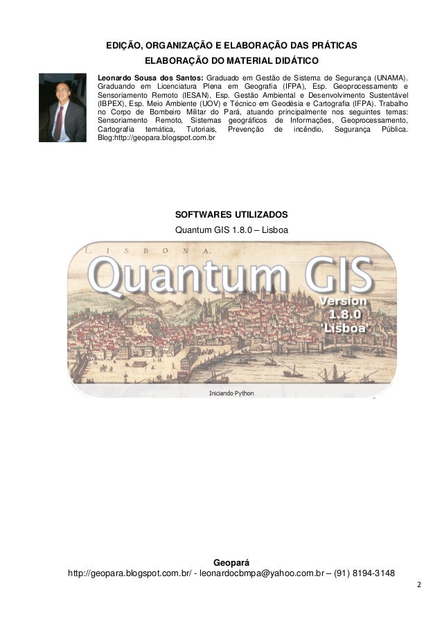 2. 2. EDIÇÃO, ORGANIZAÇÃO E ELABORAÇÃO DAS ELABORAÇÃO DO http://geopara.blogspot.com.br/ Leonardo Sousa dos Santos: Graduando em Licenciatura Plena em Geografia (IFPA), Esp. Geoprocessamento e Sensoriamento Remoto (IESAN), Esp. Gestão Ambiental e Desenvolvimento Sustentável (IBPEX), Esp. Meio Ambiente (UOV) e Técnico no Corpo de Bombeiro Militar do Pará, atuando principalmente nos seguintes temas: Sensoriamento Remoto, Sistemas geográficos de Informações, Geoprocessamento, Cartografia temática, Tutoriais, Prevenção de incêndio Blog:http://geopara.blogspot.com.br EDIÇÃO, ORGANIZAÇÃO E ELABORAÇÃO DAS PRÁTICAS ELABORAÇÃO DO MATERIAL DIDÁTICO SOFTWARES UTILIZADOS Quantum GIS 1.8.0 – Lisboa Geopará http://geopara.blogspot.com.br/ - leonardocbmpa@yahoo.com.br Leonardo Sousa dos Santos: Graduado em Gestão de Sistema de Segurança (UNAMA). Graduando em Licenciatura Plena em Geografia (IFPA), Esp. Geoprocessamento e Sensoriamento Remoto (IESAN), Esp. Gestão Ambiental e Desenvolvimento Sustentável (IBPEX), Esp. Meio Ambiente (UOV) e Técnico em Geodésia e Cartografia (IFPA). no Corpo de Bombeiro Militar do Pará, atuando principalmente nos seguintes temas: Sensoriamento Remoto, Sistemas geográficos de Informações, Geoprocessamento, Cartografia temática, Tutoriais, Prevenção de incêndio Blog:http://geopara.blogspot.com.br 2 PRÁTICAS leonardocbmpa@yahoo.com.br – (91) 8194-3148 Graduado em Gestão de Sistema de Segurança (UNAMA). Graduando em Licenciatura Plena em Geografia (IFPA), Esp. Geoprocessamento e Sensoriamento Remoto (IESAN), Esp. Gestão Ambiental e Desenvolvimento Sustentável m Geodésia e Cartografia (IFPA). Trabalho no Corpo de Bombeiro Militar do Pará, atuando principalmente nos seguintes temas: Sensoriamento Remoto, Sistemas geográficos de Informações, Geoprocessamento, Cartografia temática, Tutoriais, Prevenção de incêndio, Segurança Pública.