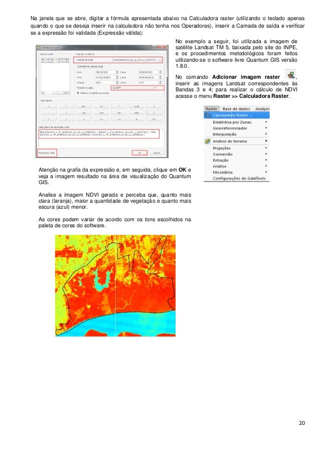 20. 20. Na janela que se abre, digitar a fórmula apresentada abaixo na Calculadora raster (utilizando o teclado apenas quando o que se deseja inserir na calculadora não tenha nos Operadores), inserir a Camada de saída e verificar se a expressão foi validada (Expressão válida): Atenção na grafia da expressão e, em seguida, clique em veja a imagem resultado na área de visualização do Quantum GIS. Analise a imagem NDVI gerada e perceba que, quanto mais clara (laranja), maior a quantidade de vegetação e quanto ma escura (azul) menor. As cores podem variar de acordo com os tons escolhidos paleta de cores do software. digitar a fórmula apresentada abaixo na Calculadora raster (utilizando o teclado apenas quando o que se deseja inserir na calculadora não tenha nos Operadores), inserir a Camada de saída e verificar se a expressão foi validada (Expressão válida): No exemplo a seguir, foi utilizada a imagem de satélite Landsat TM 5, baixada pelo site do INPE, e os procedimentos metodológicos foram feitos utilizando-se o software livre Quantum 1.8.0. No comando Adicionar imagem raster inserir as imagens Landsat correspondentes às Bandas 3 e 4; para realizar o cálculo de NDVI acesse o menu Raster >> Calculadora Raster ão na grafia da expressão e, em seguida, clique em OK e veja a imagem resultado na área de visualização do Quantum Analise a imagem NDVI gerada e perceba que, quanto mais clara (laranja), maior a quantidade de vegetação e quanto mais As cores podem variar de acordo com os tons escolhidos na 20 digitar a fórmula apresentada abaixo na Calculadora raster (utilizando o teclado apenas quando o que se deseja inserir na calculadora não tenha nos Operadores), inserir a Camada de saída e verificar No exemplo a seguir, foi utilizada a imagem de satélite Landsat TM 5, baixada pelo site do INPE, e os procedimentos metodológicos foram feitos se o software livre Quantum GIS versão Adicionar imagem raster , inserir as imagens Landsat correspondentes às Bandas 3 e 4; para realizar o cálculo de NDVI Raster >> Calculadora Raster.