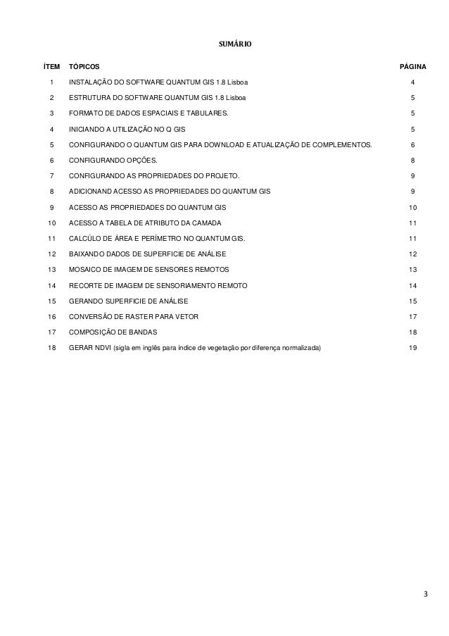 3. 3. 3 SUMÁRIO ÍTEM TÓPICOS PÁGINA 1 INSTALAÇÃO DO SOFTWARE QUANTUM GIS 1.8 Lisboa 4 2 ESTRUTURA DO SOFTWARE QUANTUM GIS 1.8 Lisboa 5 3 FORMATO DE DADOS ESPACIAIS E TABULARES. 5 4 INICIANDO A UTILIZAÇÃO NO Q GIS 5 5 CONFIGURANDO O QUANTUM GIS PARA DOWNLOAD E ATUALIZAÇÃO DE COMPLEMENTOS. 6 6 CONFIGURANDO OPÇÕES. 8 7 CONFIGURANDO AS PROPRIEDADES DO PROJETO. 9 8 ADICIONAND ACESSO AS PROPRIEDADES DO QUANTUM GIS 9 9 ACESSO AS PROPRIEDADES DO QUANTUM GIS 10 10 ACESSO A TABELA DE ATRIBUTO DA CAMADA 11 11 CALCÚLO DE ÁREA E PERÍMETRO NO QUANTUM GIS. 11 12 BAIXANDO DADOS DE SUPERFICIE DE ANÁLISE 12 13 MOSAICO DE IMAGEM DE SENSORES REMOTOS 13 14 RECORTE DE IMAGEM DE SENSORIAMENTO REMOTO 14 15 GERANDO SUPERFICIE DE ANÁLISE 15 16 CONVERSÃO DE RASTER PARA VETOR 17 17 COMPOSIÇÃO DE BANDAS 18 18 GERAR NDVI (sigla em inglês para índice de vegetação por diferença normalizada) 19