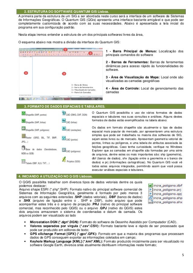 5. 5. 2. ESTRUTURA DO SOFTWARE QUANTUM GIS A primeira parte da estrutura de um SIG a ser abordada neste de Informações Geográficas. O Quantum GIS (QG completamente customizada de acordo com as suas necessidades. Abaixo é apresentada a tela inicial do programa em sua configuração padrão. Nesta etapa iremos entender a estrutura de um dos principais softwares livres da área, O esquema abaixo nos mostra a divisão da interface do Quantum GIS: 3. FORMATO DE DADOS ESPACIAIS E TABULARES. 4. INICIANDO A UTILIZAÇÃO NO Q GIS Lisboas. • Microstation DGN (*.dgn*.DGN): • Valores separados por vírgula (*.csv*.CSV): pode ser produzido em editores de texto; • GPS eXchange Format [GPX] (*.gpx*.GPX): dados de GPS conseguem exportar as informações coletados em campo; • Keyhole Markup Language [KML] (*.kml*.KM software Google Earth, diversos sites atualmente distribuem informações neste formato; O QGIS possibilita trabalhar com diversos tipos de dados vetoriais dentre os quais podemos destacar: Arquivo shape ESRI (*.shp*.SHP): Formato nativo do principal software comercial de Sistemas de Informação Geográfica, geralmente é formado por pelo menos 3 arquivos com as seguintes extensões . e .SHX (arquivo de ligação entre o . SHP e .DBF), outro arquivo que pode acompanhar estes três e o arquivo de projeção . comercial, mas reconhecido pelo QGIS) ou o arquivo . dois arquivos armazenam o sistema arquivos podem ser visualizado ao lado ESTRUTURA DO SOFTWARE QUANTUM GIS Lisboa. A primeira parte da estrutura de um SIG a ser abordada neste curso será a interface de um software de Sistemas O Quantum GIS (QGis) apresenta uma interface bastante amigável e que pode completamente customizada de acordo com as suas necessidades. Abaixo é apresentada a tela inicial do programa em sua configuração padrão. Nesta etapa iremos entender a estrutura de um dos principais softwares livres da área, mostra a divisão da interface do Quantum GIS: FORMATO DE DADOS ESPACIAIS E TABULARES. 4. INICIANDO A UTILIZAÇÃO NO Q GIS Lisboas. Microstation DGN (*.dgn*.DGN): Formato do software de Desenho Assistido por Computador (CAD). Valores separados por vírgula (*.csv*.CSV): Formato bastante leve e rápido de ser pode ser produzido em editores de texto; GPS eXchange Format [GPX] (*.gpx*.GPX): Formato em que a maioria dos programas que processam dados de GPS conseguem exportar as informações coletados em campo; Keyhole Markup Language [KML] (*.kml*.KML): Formato produzido inicialmente para ser visualizado no software Google Earth, diversos sites atualmente distribuem informações neste formato; 1 - Barra Principal de Menus: principais comandos do software 2 - Barras de Ferramentas: dinâmicas para acesso rápido às funcionalidades do software. 3 - Área de Visualização do Mapa: visualizadas as camadas geográficas 4 - Área de Controle: camadas O Quantum GIS possibilita o uso de vários formatos de dados espaciais e tabulares nas suas consultas e análises. Alguns destes formatos de dados estão exemplificados na tabela abaixo: Os dados em formato shapefile são atualmente o tipo de dados espacial mais popular do mercado, por apresentarem uma estrutura simples que pode ser trabalhada na maioria dos softwares de SIG, sejam estes livres ou de mercado. Apresentam geometria vetorial de pontos, linhas ou polígonos, e uma tabela de atributos associada às feições geográficas. Caso tenha curiosidade, verifique no Windows Explorer que as camadas em shapefile são formadas por uma série de arquivos, dentre estes os mais importantes são: shp (geometria), dbf (banco de dados), shx (ligação entre a geometria e o banco de dados) e prj (informações cartográficas). No Quantum GIS você vê todos estes arquivos integrados, permitindo assim que você possa executar análises espaciais e tabulares. O QGIS possibilita trabalhar com diversos tipos de dados vetoriais dentre os quais Arquivo shape ESRI (*.shp*.SHP): Formato nativo do principal software comercial de Sistemas de Informação Geográfica, geralmente é formado por pelo menos 3 com as seguintes extensões .SHP (dados vetoriais), .DBF (banco de dados) ligação entre o . SHP e .DBF), outro arquivo que pode e o arquivo de projeção .PRJ (nativo do principal software pelo QGIS) ou o arquivo .QPJ (nativo do QGIS) estes dois arquivos armazenam o sistema de coordenadas e datum da camada. Os os podem ser visualizado ao lado 5 será a interface de um software de Sistemas ) apresenta uma interface bastante amigável e que pode ser completamente customizada de acordo com as suas necessidades. Abaixo é apresentada a tela inicial do Nesta etapa iremos entender a estrutura de um dos principais softwares livres da área, Formato do software de Desenho Assistido por Computador (CAD). Formato bastante leve e rápido de ser processado que Formato em que a maioria dos programas que processam Formato produzido inicialmente para ser visualizado no software Google Earth, diversos sites atualmente distribuem informações neste formato; Barra Principal de Menus: Localização dos principais comandos do software Barras de Ferramentas: Barras de ferramentas dinâmicas para acesso rápido às funcionalidades do alização do Mapa: Local onde são visualizadas as camadas geográficas Área de Controle: Local de gerenciamento das O Quantum GIS possibilita o uso de vários formatos de dados nas suas consultas e análises. Alguns destes formatos de dados estão exemplificados na tabela abaixo: Os dados em formato shapefile são atualmente o tipo de dados espacial mais popular do mercado, por apresentarem uma estrutura hada na maioria dos softwares de SIG, sejam estes livres ou de mercado. Apresentam geometria vetorial de pontos, linhas ou polígonos, e uma tabela de atributos associada às feições geográficas. Caso tenha curiosidade, verifique no Windows amadas em shapefile são formadas por uma série de arquivos, dentre estes os mais importantes são: shp (geometria), db