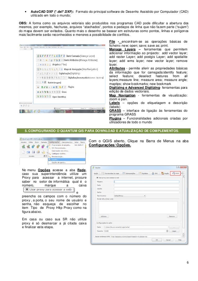 6. 6. • AutoCAD DXF (*.dxf*.DXF): utilizado em todo o mundo; OBS: A forma como os arquivos vetoriais são produzidos nos programas CAD pode dificultar a abertura dos mesmos, por exemplo, hachuras, arquivos “atachados”, pontos e pedaços de linha que não fazem parte (“sujam”) do mapa devem ser evitados. Quanto mais o desenho se basear em estruturas como pontos, linhas e polígonos mais facilmente serão reconhecidos e menores a possibilidade de conflitos. 5. CONFIGURANDO O QUANTUM GIS PARA DOWNLOAD E ATUALIZAÇÃO DE COMPLEMENTOS No menu Opções acesse a aba caso sua superintendência utilize um Proxy para acessar a internet, procure saber no setor de informática qual é o número, marque a caixa preencha os campos com o número do proxy , a porta, o seu nome de usuário e senha, não esqueça de escolher no item Tipo de Proxy Http Proxy como na figura abaixo. Em casa ou caso sua SR não utilize proxy é só desmarcar a já citada caixa e finalizar esta etapa. AutoCAD DXF (*.dxf*.DXF): Formato do principal software de Desenho Assistido por Computador (CAD) A forma como os arquivos vetoriais são produzidos nos programas CAD pode dificultar a abertura dos mesmos, por exemplo, hachuras, arquivos “atachados”, pontos e pedaços de linha que não fazem parte (“sujam”) . Quanto mais o desenho se basear em estruturas como pontos, linhas e polígonos mais facilmente serão reconhecidos e menores a possibilidade de conflitos. CONFIGURANDO O QUANTUM GIS PARA DOWNLOAD E ATUALIZAÇÃO DE COMPLEMENTOS Com o QGIS aberto, Clique na Barra de Configurações/ Opções. acesse a aba Rede, caso sua superintendência utilize um Proxy para acessar a internet, procure saber no setor de informática qual é o número, marque a caixa e preencha os campos com o número do proxy , a porta, o seu nome de usuário e de escolher no Proxy como na Em casa ou caso sua SR não utilize marcar a já citada caixa File - encontram-se as operações básicas de ficheiro: new; open; save; save as; print. Manage Layers – adicionar informação ao projecto: add vector layer; add raster Layer; add postgis Layer; add spatialite layer; add wms layer; new vector layer; remove layer. Attributes - permite aferir as propriedades básicas da informação que for carregada:identify feature; select feature; deselect features from all layers;measure line; measure area; measure maptips; show bookmarks; new bookmark Digitizing e Advanced Digitizing edição de dados vectoriais. Map Navigation - ferramentas de visualização: zoom e pan. Labels – opções de etiquetagem e descrição (labels) GRASS – interface de ligação às ferramentas do programa GRASS Plugins – Funcionalidades adicionais criadas por utilizadores de todo o mundo 6 Formato do principal software de Desenho Assistido por Computador (CAD) A forma como os arquivos vetoriais são produzidos nos programas CAD pode dificultar a abertura dos mesmos, por exemplo, hachuras, arquivos “atachados”, pontos e pedaços de linha que não fazem parte (“sujam”) . Quanto mais o desenho se basear em estruturas como pontos, linhas e polígonos CONFIGURANDO O QUANTUM GIS PARA DOWNLOAD E ATUALIZAÇÃO DE COMPLEMENTOS. Com o QGIS aberto, Clique na Barra de Menus na aba se as operações básicas de ficheiro: new; open; save; save as; print. ferramentas que permitem adicionar informação ao projecto: add vector layer; add raster Layer; add postgis Layer; add spatialite layer; add wms layer; new vector layer; remove permite aferir as propriedades básicas ão que for carregada:identify feature; select feature; deselect features from all ure line; measure area; measure angle; maptips; show bookmarks; new bookmark Digitizing e Advanced Digitizing- ferramentas para edição de dados vectoriais. ferramentas de visualização: opções de etiquetagem e descrição interface de ligação às ferramentas do Funcionalidades adicionais criadas por utilizadores de todo o mundo