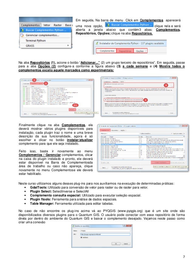 7. 7. Na aba Repositórios (1), acione o botão “ para a aba Opções (2) configure complementos exceto aquele marcados como experimentais: Neste curso utilizamos alguns desses plug Neste curso utilizamos alguns desses plug • GdalTools: Utilizado para conversão de vetor para raster ou de raster para vetor. • Plugin Select: SelectInverse e SelectAll • Complemento consulta espacial: • Plugin ftools: Ferramenta para análise de dados espaciais. • Table Manager: Ferramenta utilizada para editar tabelas. No caso de não encontre os plug disponibilizados diversos plugins para o Quantum GIS. O usuário pode conectar com esse repositório de forma direta por dentro do ambiente do Quantum GIS e baixar o complemento desejado. Vejamos neste passo como criar uma conexão Finalmente clique na aba Complementos deverá mostrar vários plugins disponíveis para instalação, cada plugin traz o nome e uma breve descrição da sua funcionalidade, agora é só escolher e clicar no botão instalar/atualizar complemento para que ele seja instalado. Feito isso, basta ir novamente ao menu Complementos / Gerenciar complementos, clicar na caixa do plugin instalado e pronto, ele deverá estar disponível na Barra de Complementosda área de trabalho ou caso não apareça, clique novamente no menu Complementose ele deverá estar habilitado. acione o botão “Adicionar...” (2) um grupo terceiro de repositórios”. configure-a conforme a figura abaixo (3) a cada semana complementos exceto aquele marcados como experimentais: Neste curso utilizamos alguns desses plug-ns para nos auxiliarmos na execução de Neste curso utilizamos alguns desses plug-ins para nos auxiliarmos na execução de Utilizado para conversão de vetor para raster ou de raster para vetor. SelectInverse e SelectAll Complemento consulta espacial: Utilizado para executar seleção espacial. Ferramenta para análise de dados espaciais. Ferramenta utilizada para editar tabelas. No caso de não encontre os plug-ins acima vá ao PYQGIS (www.pyqgis.org) para o Quantum GIS. O usuário pode conectar com esse repositório de forma direta por dentro do ambiente do Quantum GIS e baixar o complemento desejado. Vejamos neste passo como Em seguida, Na barra de menu Click em Complementos uma nova opção, aberta a janela abaixo que contém3 abas: Repositórios, Opções; clique na aba Repositórios. Complementos, ela disponíveis para instalação, cada plugin traz o nome e uma breve funcionalidade, agora é só instalar/atualizar para que ele seja instalado. vamente ao menu complementos, clicar na caixa do plugin instalado e pronto, ele deverá na Barra de Complementosda área de trabalho ou caso não apareça, clique no menu Complementose ele deverá 7 repositórios”. Em seguida, passe a cada semana e (4) Mostra todos o determinadas práticas: Utilizado para conversão de vetor para raster ou de raster para vetor. Utilizado para executar seleção espacial. PYQGIS (www.pyqgis.org) que é um site onde são para o Quantum GIS. O usuário pode conectar com esse repositório de forma direta por dentro do ambiente do Quantum GIS e baixar o complemento desejado. Vejamos neste passo como Complementos aparecerá clique nela e será aberta a janela abaixo que contém3 abas: Complementos, Repositórios.