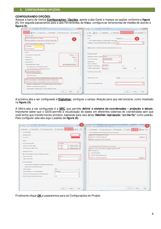 8. 8. 6. CONFIGURANDO OPÇÕES. CONFIGURANDO OPÇÕES. Acesse a barra de menus Configurações / Opções (1). Em seguida passaremos para a aba Ferramentas de Mapa, configure as figura (2). A próxima aba a ser configurada é na figura (3). A última aba a ser configurada é a Importante saber que o QGIS permite a visualização de você tenha que transformá-los primeiro, bastando para isso ativar Para configurar esta aba siga o padrão da Finalmente clique OK e passaremos para as Configurações do Projeto. CONFIGURANDO OPÇÕES. Configurações / Opções, aperte a aba Geral e marque as opções conforme a Em seguida passaremos para a aba Ferramentas de Mapa, configure as ferramentas de medida A próxima aba a ser configurada é Digitalizar, configure o campo Atração para que ele funcione, como mostrado A última aba a ser configurada é a SRC, que permite definir o sistema de coordenadas IS permite a visualização de dados em diferentes sistemas de coordenadas sem que primeiro, bastando para isso ativar Habilitar reprojeção “on the fly” Para configurar esta aba siga o padrão da figura (4). e passaremos para as Configurações do Projeto. 8 marque as opções conforme a figura ferramentas de medida de acordo a que ele funcione, como mostrado definir o sistema de coordenadas – projeção e datum. dados em diferentes sistemas de coordenadas sem que Habilitar reprojeção “on the fly” como padrão.